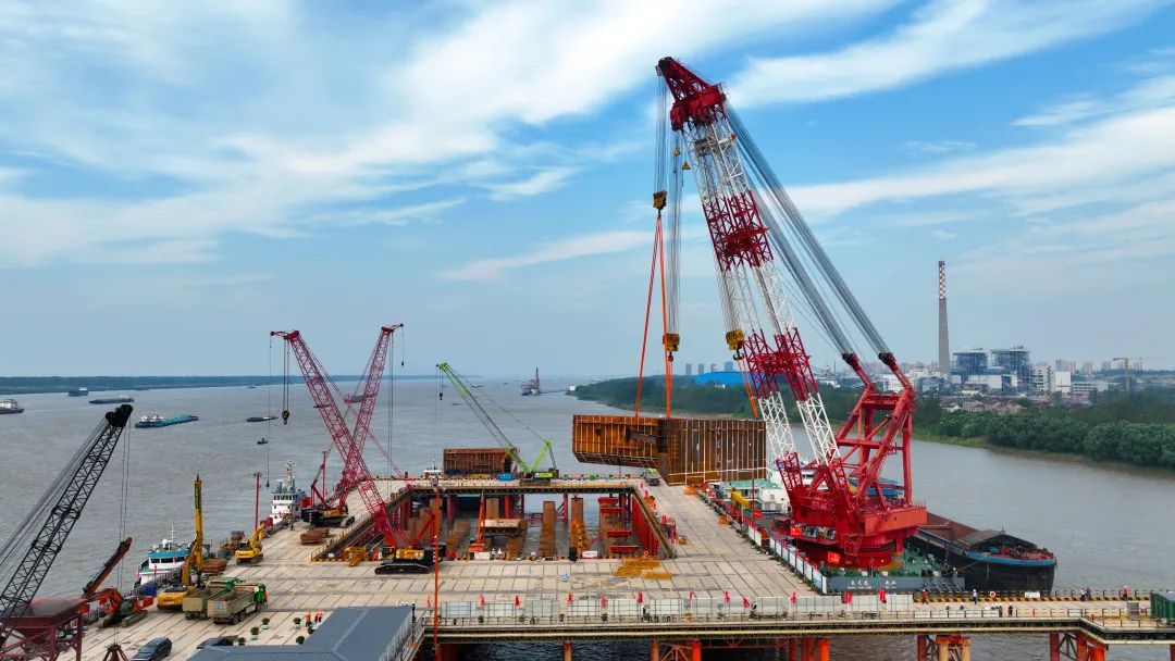 大橋按照“公路+城際鐵路+城市軌道交通”合并過江的標(biāo)準(zhǔn)建設(shè)。上層作為寧樅高速公路的過江通道,按雙向6車道布設(shè),設(shè)計時速100公里;下層承載兩線合池城際鐵路,設(shè)計時速250公里;預(yù)留兩線池銅市域鐵路,設(shè)計時速160公里。池州長江公鐵大橋共設(shè)計有 42 個橋墩,其中3號、4號墩為主塔墩,均位于離岸長江水域。7月26日,南主塔墩(4號墩)基77根樁基完成,本次下放的首節(jié)鋼圍堰為樁基上部銜接部分。